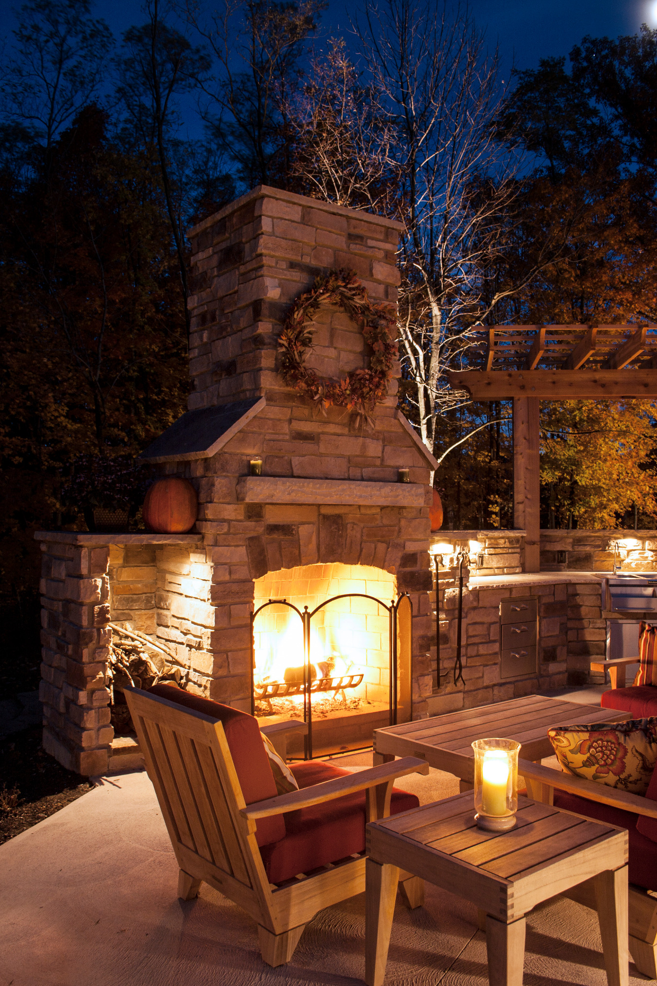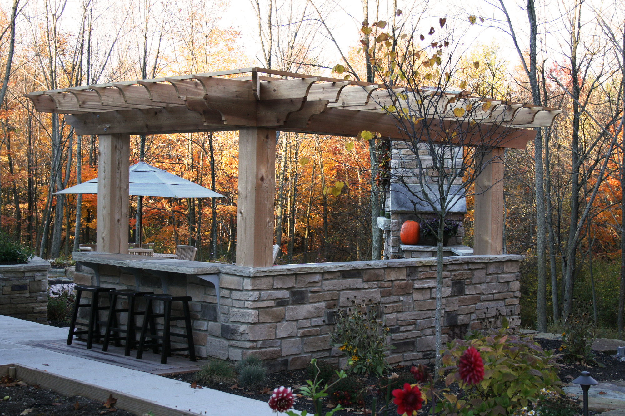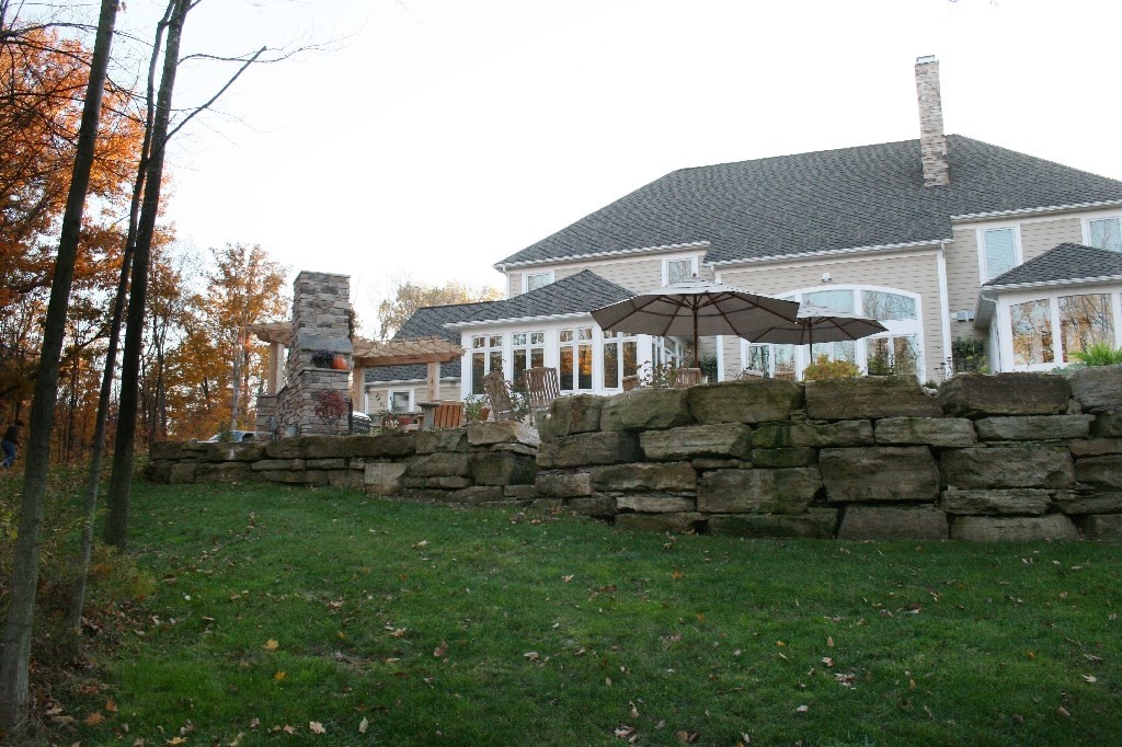 When we were asked to design this back yard we were intrigued. The client being a builder knew the components that he and his family wanted. The scope of work included terrace for dinning, outdoor kitchen and an ornamental pond. In the end we incorporated an upper terrace for the dining area and since there was a severe grade change we designed a lower terrace with kitchen and fireplace as a secondary area to relax and listen to the ornamental stream and pond while looking at the wooded lot. By using natural materials on the fireplace, kitchen and pergola there isn’t a night we wouldn’t want to be on this terrace