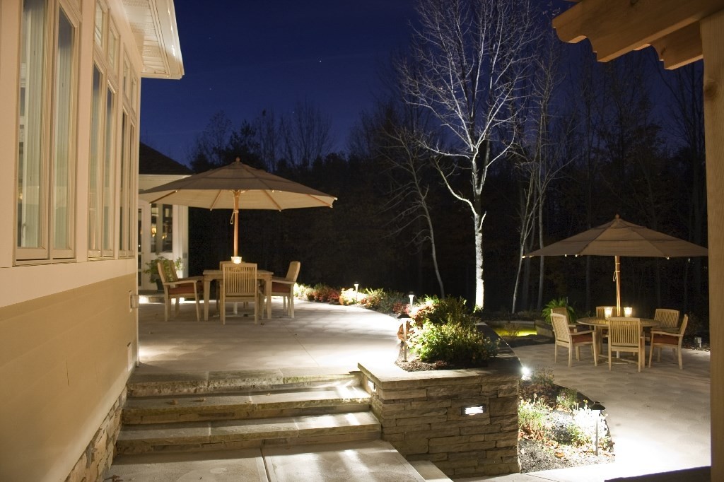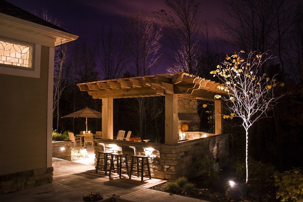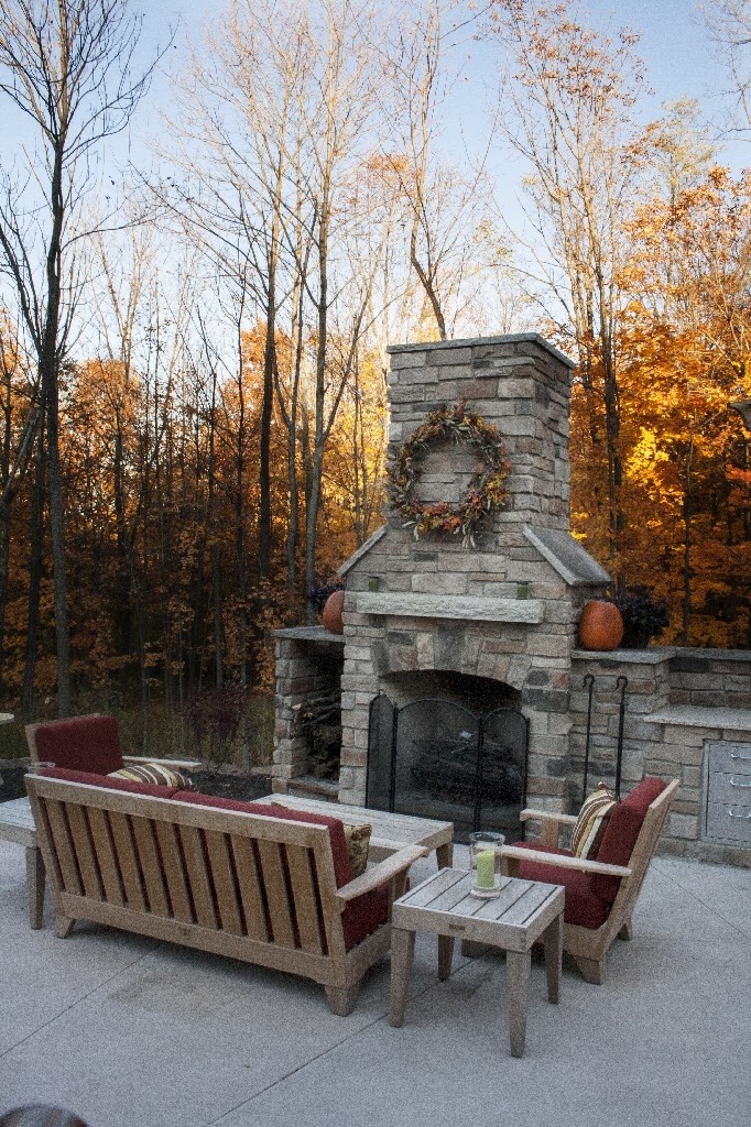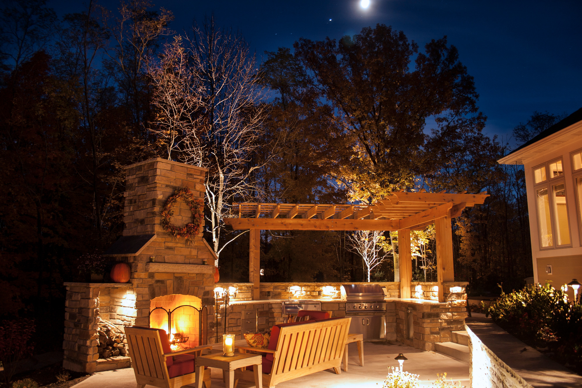 When we were asked to design this back yard we were intrigued. The client being a builder knew the components that he and his family wanted. The scope of work included terrace for dinning, outdoor kitchen and an ornamental pond. In the end we incorporated an upper terrace for the dining area and since there was a severe grade change we designed a lower terrace with kitchen and fireplace as a secondary area to relax and listen to the ornamental stream and pond while looking at the wooded lot. By using natural materials on the fireplace, kitchen and pergola there isn’t a night we wouldn’t want to be on this terrace
